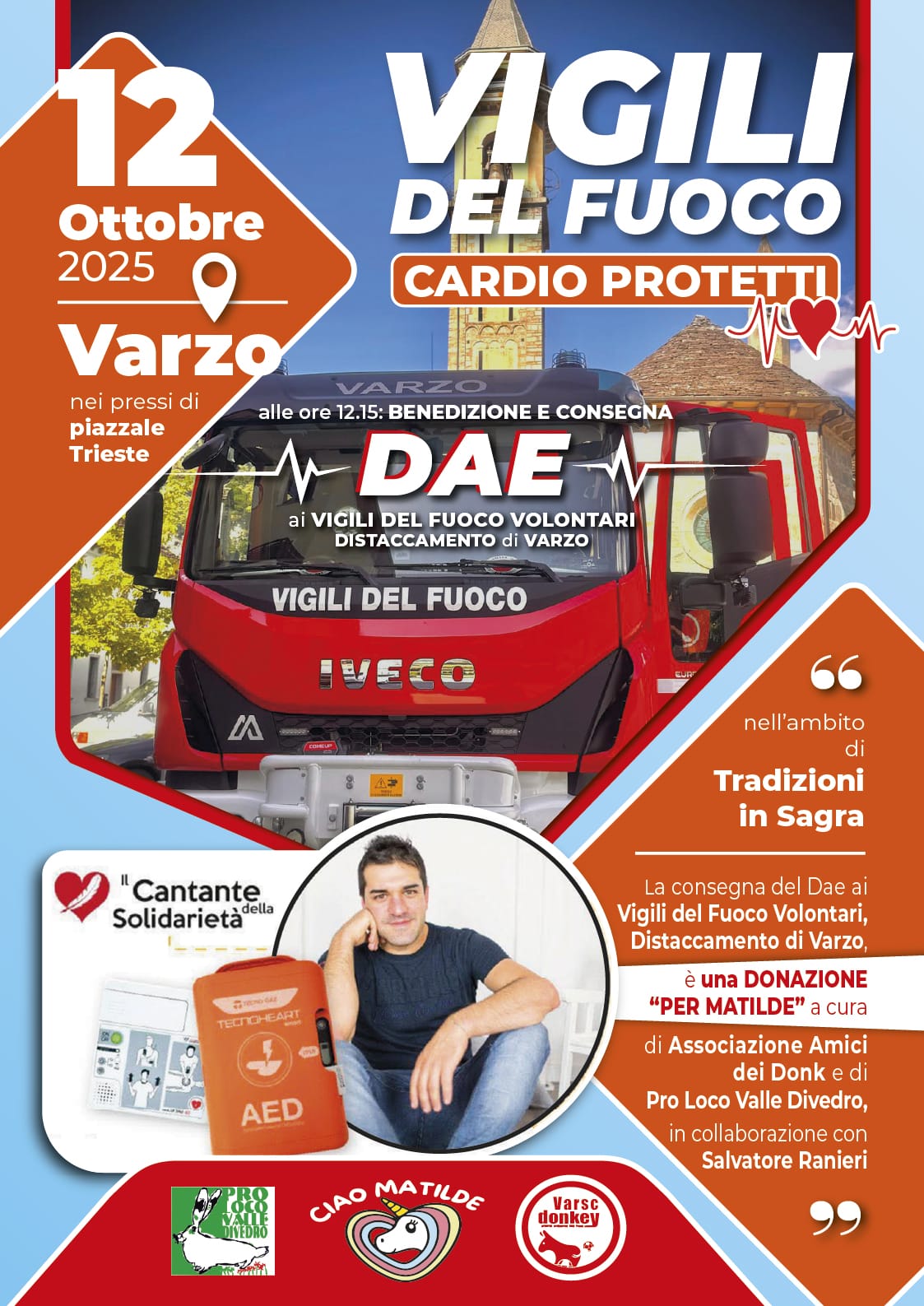 Domenica 12 ottobre nell' ambito di Tradizioni in Sagra verrà consegnato ai Vigili del Fuoco Volontari del distaccamento di Varzo il DAE, donazione "per Matilde", a cura dell' Associazione Amici dei Donk e della Pro loco Valle Divedro, in collaborazione con Salvatore Ranieri.