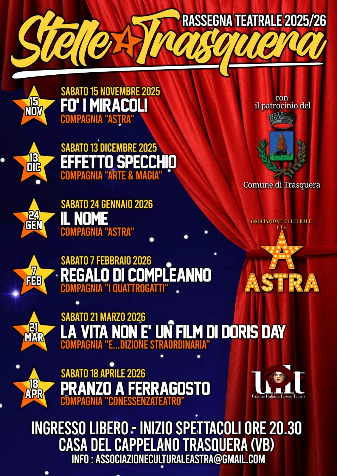 Il 15 novembre si apre la rassegna teatrale Stelle a Trasquera. Scopri il programma completo cliccando il link qui sotto.