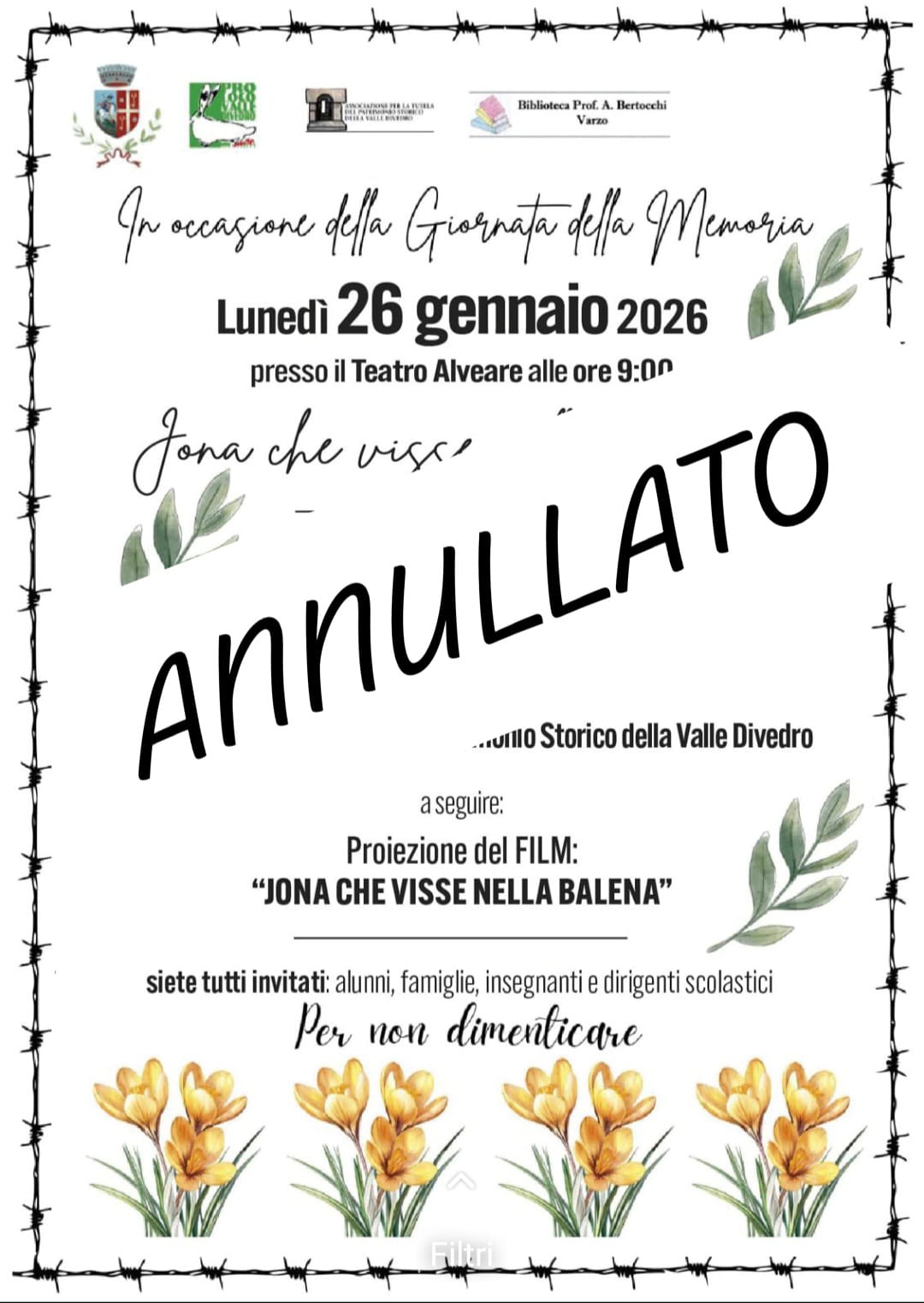 Evento per la Giornata della Memoria annullato
