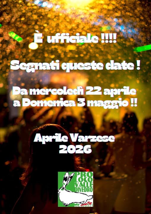 E' ufficiale: l'Aprile Varzese 2026 si terrà da mercoledì 22 aprile a domenica 3 maggio! Vi aspettiamo numerosi per festeggiare insieme a tutto il paese!